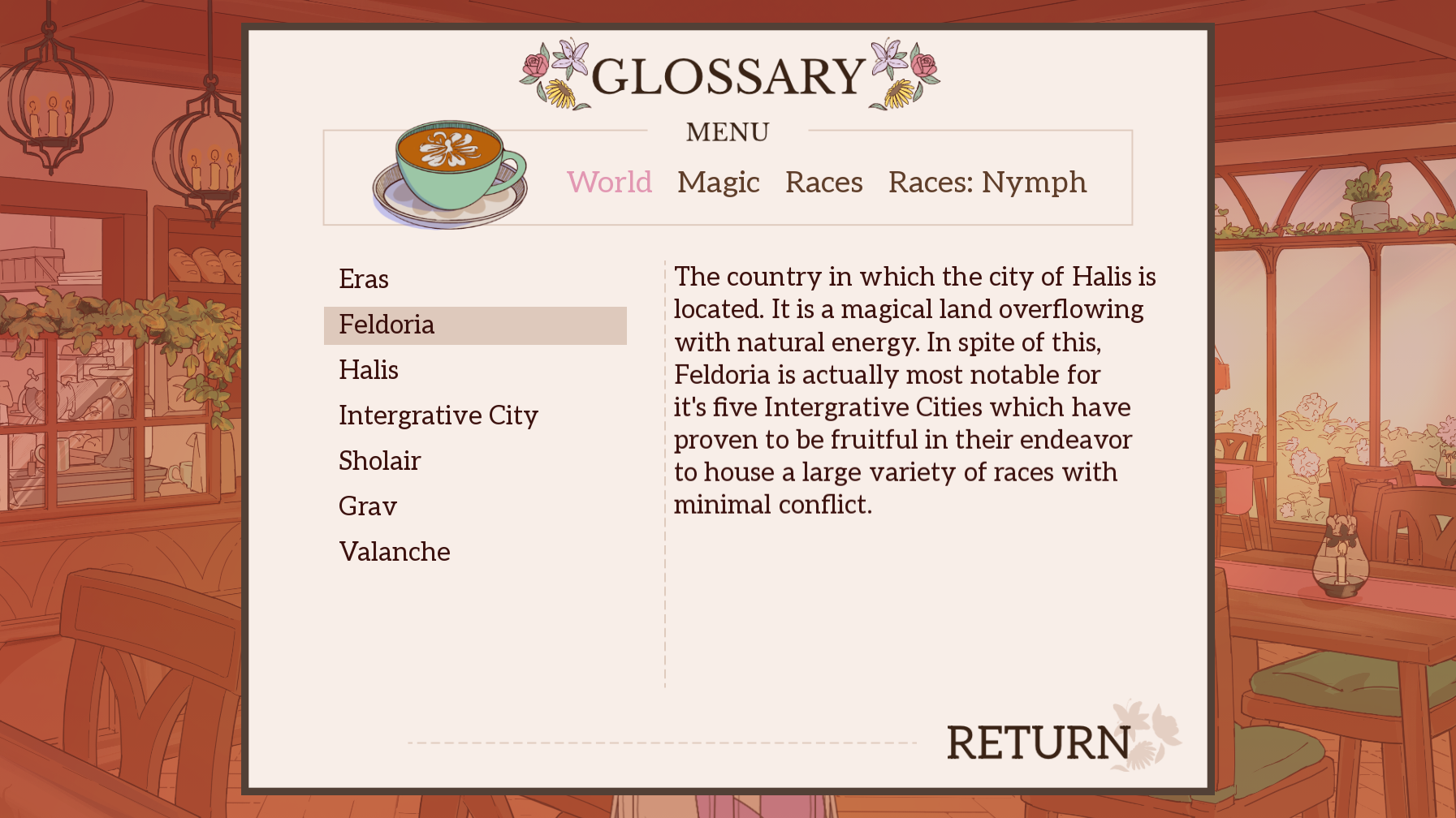 - Glossary: Read and learn about the country of Feldoria