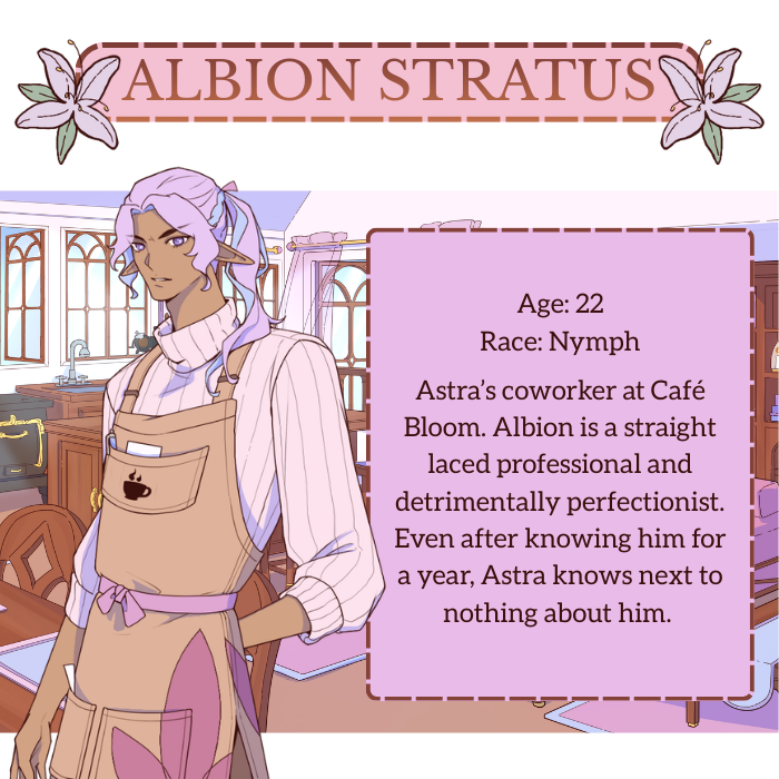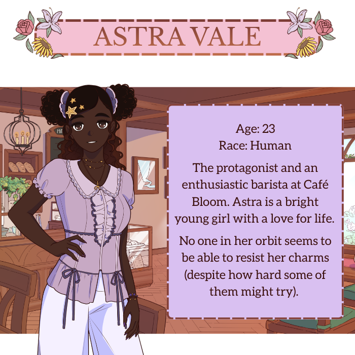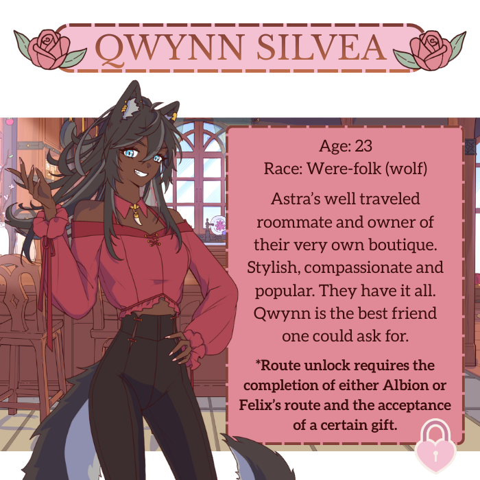 Hi!! I just wanted to say how lovely this game is, I've had SO much fun playing it and genuinely like the last couple of nights I've gone to bed thinking about it LMAOOO it's really so cute and so loved by everyone's who's worked on it like you can see it shine through! I LOVE Astra she's such a fun MC and she's SO cute I have so much fun setting her up with all of these cute babes!! I love the glossary and the little status going up and thank you for the heart indicators bc I fear I would have gotten Qwynn's bad ending without them....maybe I want to be codependent with a hot wolf who's to say....but no genuinely like I played their route last and I really love how you handle the choices because so often I think it's very easy to fall into the pattern of just agreeing with the LIs so they'll love you but this game really feels like it's about pushing them to be their best selves and growing and healing. I won't spoil for Albion's route for anyone playing but I loved getting to put the pieces together of like ahhh that's why you're a neat freak... also he's hot as hell I just gotta say sorry LMAO
