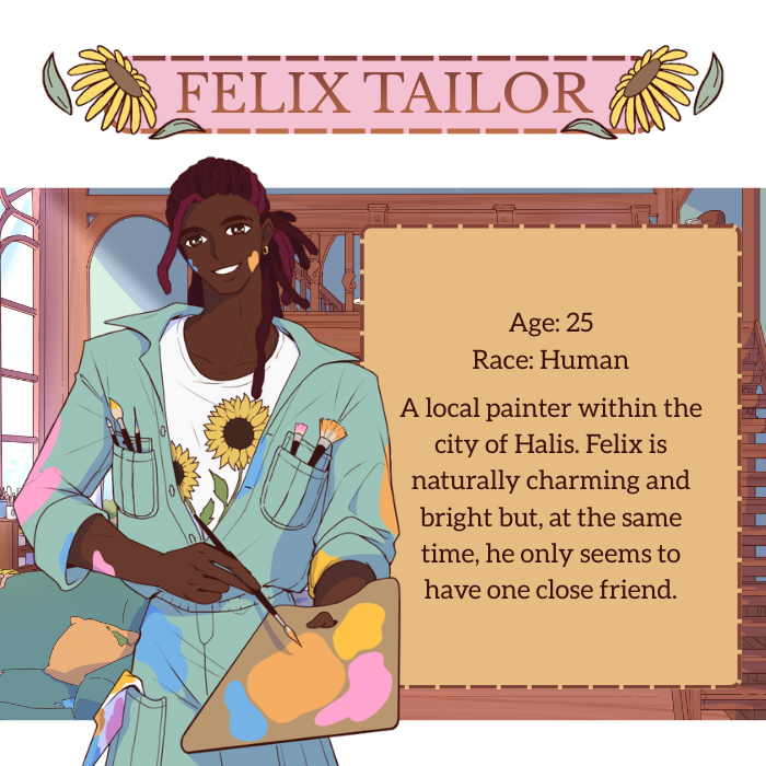 Also on a slightly more personal note like I love all of the LIs but felix in particular really spoke to me, like not only is he gorgeous obviously but he really got me like right in the heart. I won't get too much into it but I recognize him and I share a condition and seeing it depicted was very emotional for me when I kinda was picking up on what was happening, I also like that you leave blank spaces for readers to fill in, very show not tell and I think it's really effective like I genuinely started tearing up when I realized why he draws flowers in particular. I really love how he's so playful and warm, he really does feel like sunshine and he's so loveable.